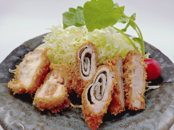 寒い季節にぴったりのエビクリームコロッケと一口ヘレカツ、大葉巻きカツの盛合せです。